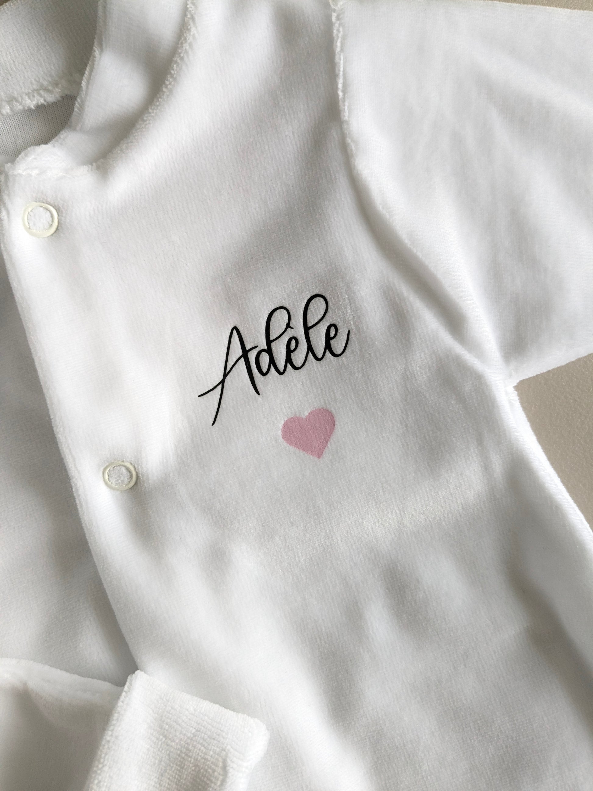 Lors de votre commande, indiquez le prénom à inscrire sur le pyjama, ainsi que la couleur du coeur. Chaque personnalisation est réalisée avec soin pour un rendu élégant et durable.